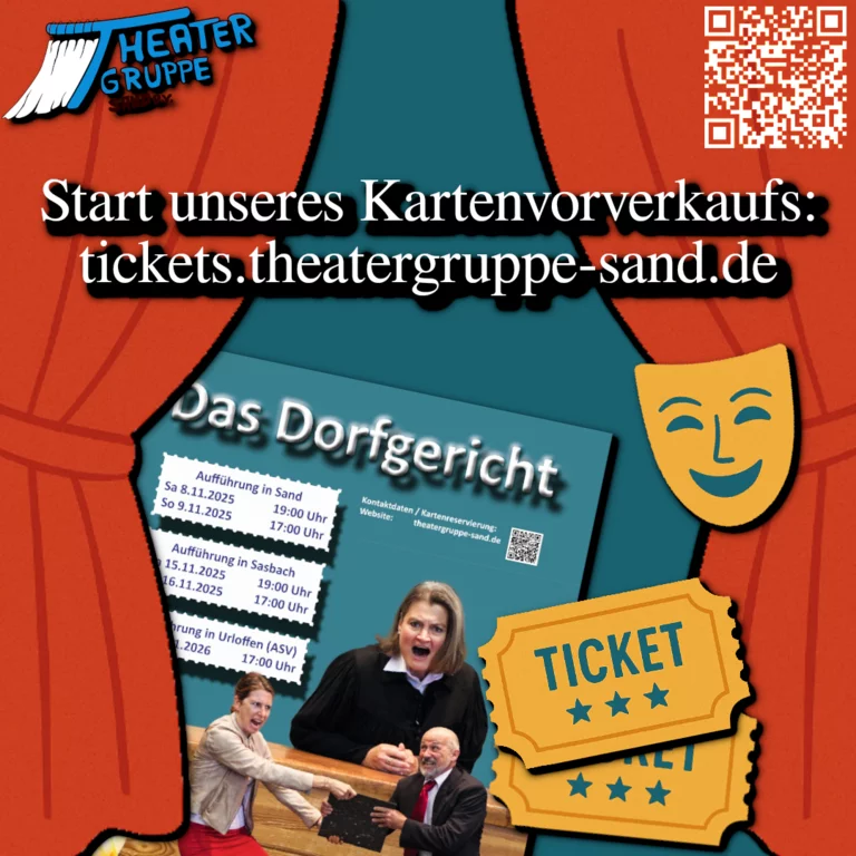 Mit „Das Dorfgericht“ bringt die Theatergruppe Sand e.V. eine spannende Komödie auf die Bühne – oder besser gesagt: direkt in die Sporthallen von Sand, Obersasbach (Grindehalle) und Urloffen (ASV). Premiere ist am Samstag, 08. November, weitere Vorstellungen folgen an den Abenden des 09., 15. und 16. Novembers sowie am 11. Januar.